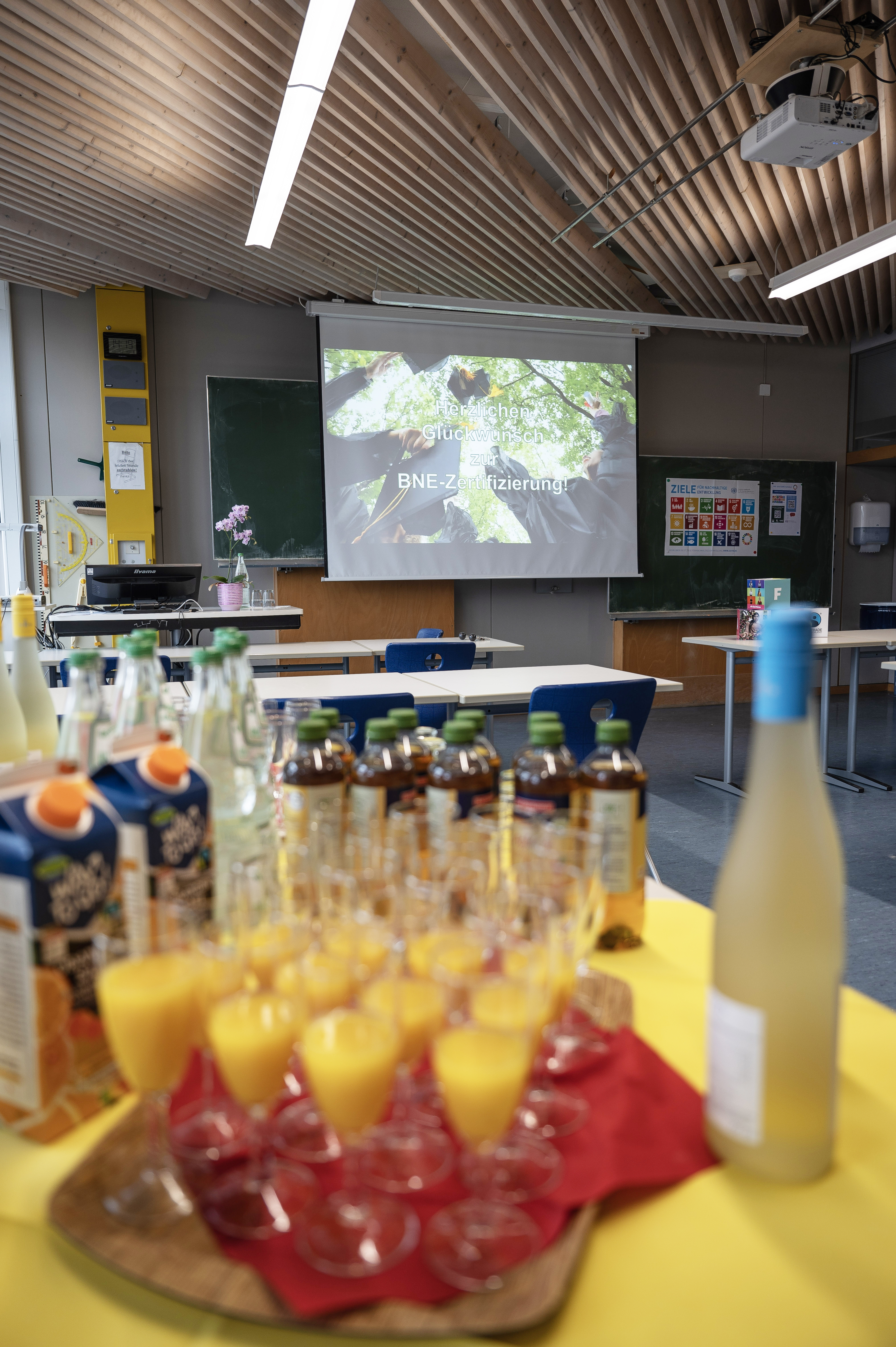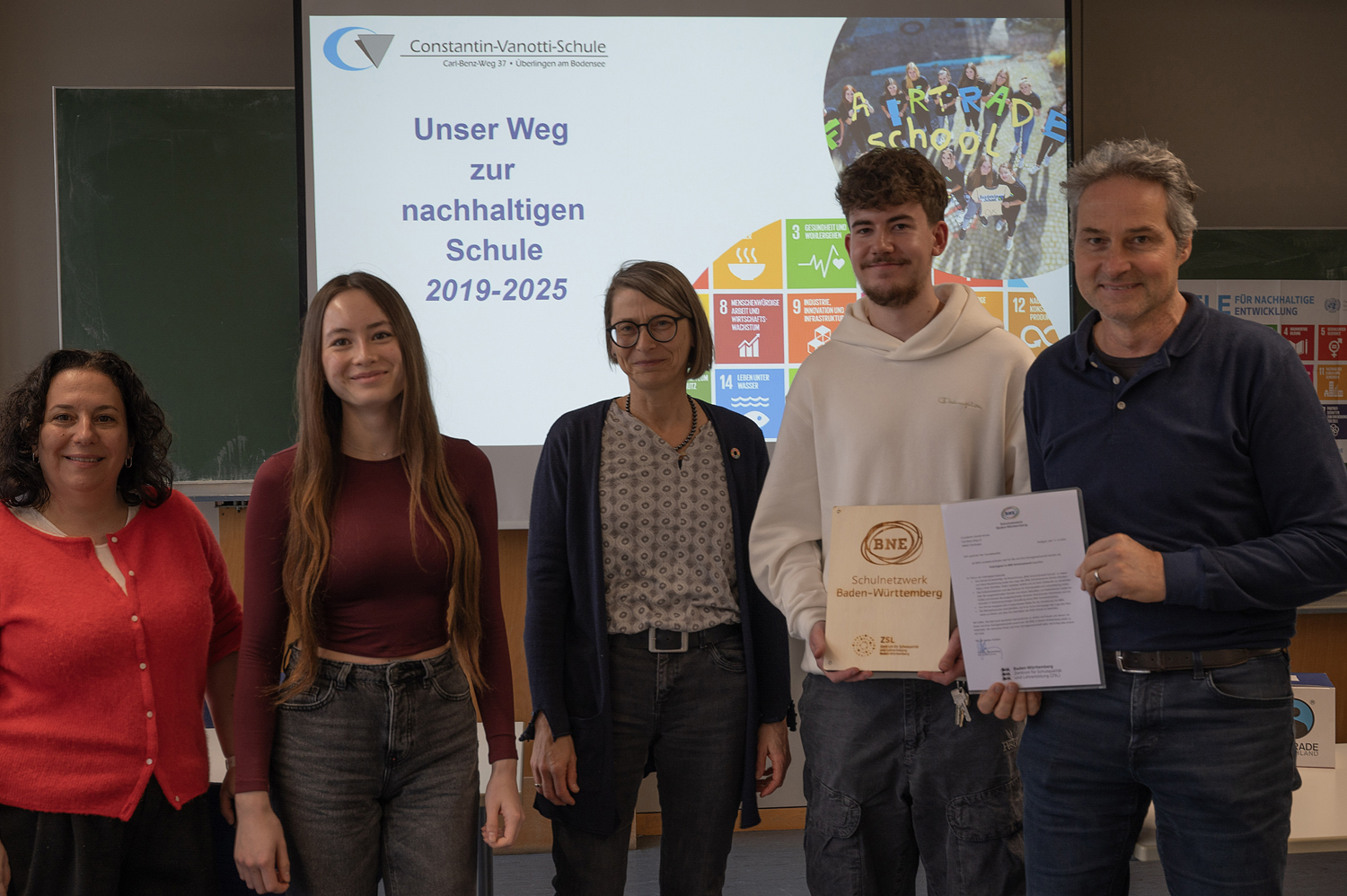 Als Würdigung der schulischen Aktivitäten rund um nachhaltige Themen überreichte Petra Wachter als Regionalkoordinatorin vom Zentrum für Schulqualität und Lehrerbildung (ZSL) der Constantin-Vanotti-Schule das BNE-Siegel und nahm die CVS so in die Riege der „BNE-Schulen“ auf – als eine der bundesweit ersten beruflichen Schulen.