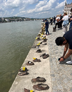 Betroffen waren wir auch beim Besuch des Kunstwerkes „Schuhe am Donauufer, wo auf einer Länge von 40 Metern sechzig Paar Schuhe aus Metall auf dem Boden angebracht wurden. Sie sollen dem Gedenken an die Massenerschießungen von ungarischen Juden am Donauufer während der faschistischen Pfeilkreuzler-Diktatur 1944/45 erinnern.