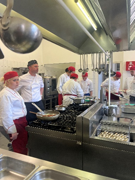 Den ersten Tag in Gyöngyös verbrachten wir an der Schule. Zuerst besuchen wir das „Sohaz” Kabinet wo der fachpraktische Teil der Ausbildung an der Schule durchgeführt wird. Dort befindet sich eine Schulküche, eine kleine Konditorwerkstatt und Räume, in denen Gäste empfangen werden können. Wir wurden mit einem Menü aus mehreren Gängen, welches die Koch Azubis selbst zubereitet haben, verwöhnt. Das Menü wurde von den Kellner Azubis stillgerecht serviert. Wir bekamen Einblick in die Kunst der Zubereitung von Cocktails und leckeren Torten.