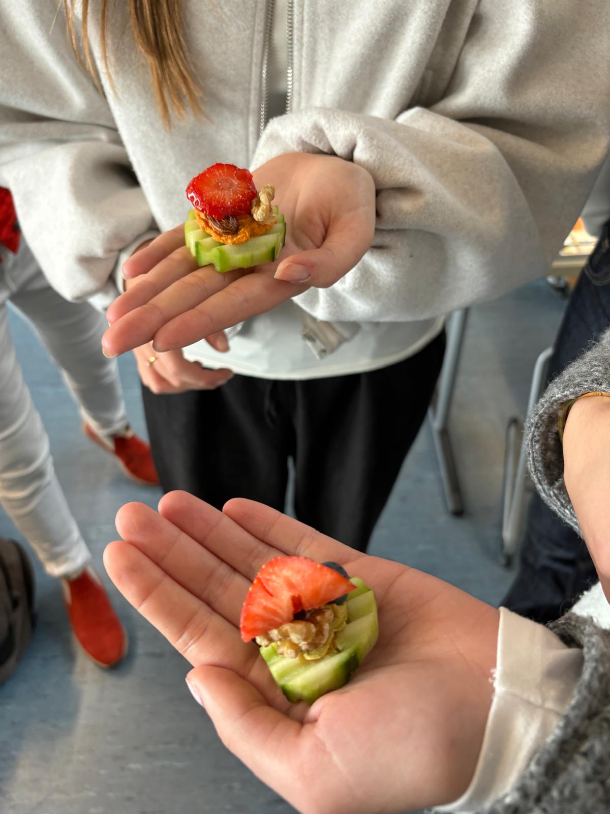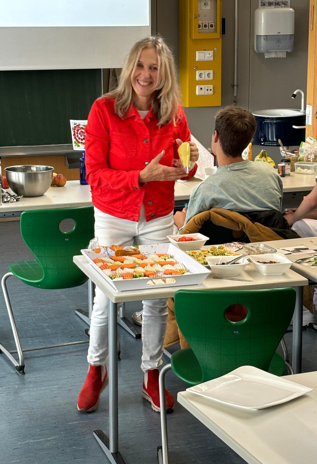 Die Schüler*innen erwartete am Montagmorgen bereits ein voll vorbereitetes Klassenzimmer, das voller gesunder Snacks und interessanter Rezept-Bücher war. Im ersten Teil ihrer Präsentation lernten sie etwas über die Auswirkungen und Folgen einer heutzutage durchschnittlichen Ernährung. Mangelhafte Ernährung nimmt dir Kraft und kann über starke Blutzuckerschwankungen, Nährstoffmangel und einen gestörten Darm, Müdigkeit, Konzentrations- und Angststörungen, Aggressionen und sogar Depressionen fördern. Im Anschluss bekamen die Schüler*innen die Aufgabe, langweilig aussehendes Gemüse lecker und attraktiv aussehen und schmecken zu lassen. Dafür bereitete Andrea Huber-Jürß Gemüse vor, welches mit verschiedensten gesunden Toppings „frisiert“ werden konnte. Die Ergebnisse konnten sich sowohl sehen als auch schmecken lassen. Zum Beispiel gab es Gurkenschnitte, die wie ein Plätzchen ausgestochen und mit Karotte gefüllt waren. Obendrauf wahlweise eine Creme aus Tomate oder Curry. Diese konnten jetzt noch mit bereits fertiggestellten Toppings wie Nüssen, Mandeln, Blaubeeren, Erdbeeren und weiteren Zutaten „frisiert“ werden. Für die Leute, die keine Karotten oder Gurken mochten, gab es alternativ noch Kohlrabi. Damit zeigte sie, wie einfach und lecker nahrhafte und gesunde Alternativen zur „Zuckerbombe“ aussehen können. Sie zeigte weitere Ideen, wie mit Gewürzen marinierte Gemüse und Süßkartoffeln aus dem Backofen und saftig belegte Vollkornsandwiches. Mit dem Spiralschneider konnten die Schülerinnen und Schüler aus rohen Gemüsen einfach Spaghetti, Tagliatelle und andere Pastaformen herstellen. Diese kann man dann mit Pesto oder würzigen Saucen kombinieren oder auch als kalten Snack genießen. Außerdem erklärte sie den Schüler*innen, dass gesunde Ernährung sich positiv auf die Schulnoten auswirken kann. Ein stabiler Blutzucker ist gut für eine gleichmäßige Gehirnleistung und gute Stimmung. Dafür brachte sie zuckerfreie Bio-Haferflocken sowie eine Flockenquetsche mit, mit der die Schüler*innen aus Haferkörnern selbst Flocken quetschen und mit Naturjoghurt und frischer Himbeersauce, Zimt und Vanille probieren durften – ein lange satt machendes Brainfood.
